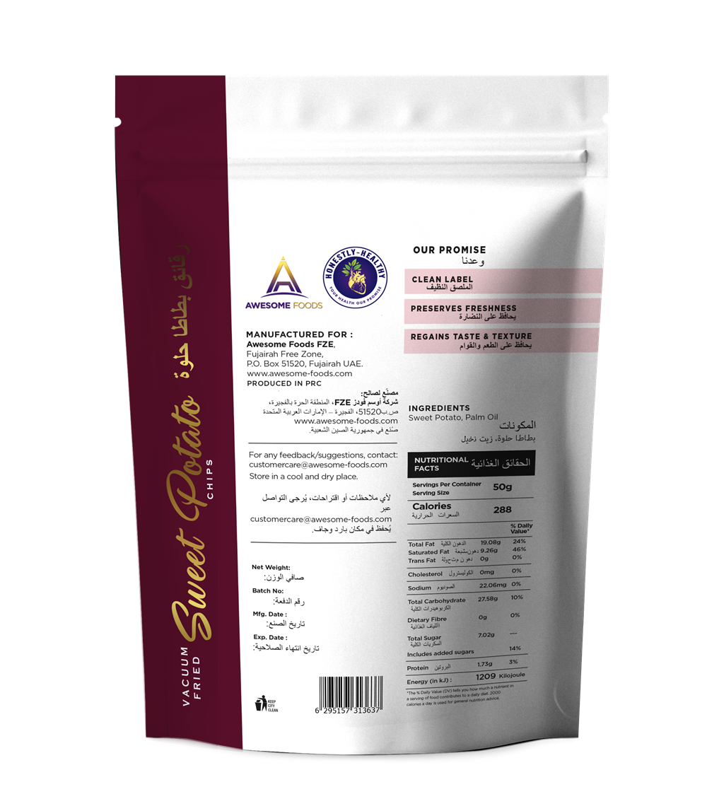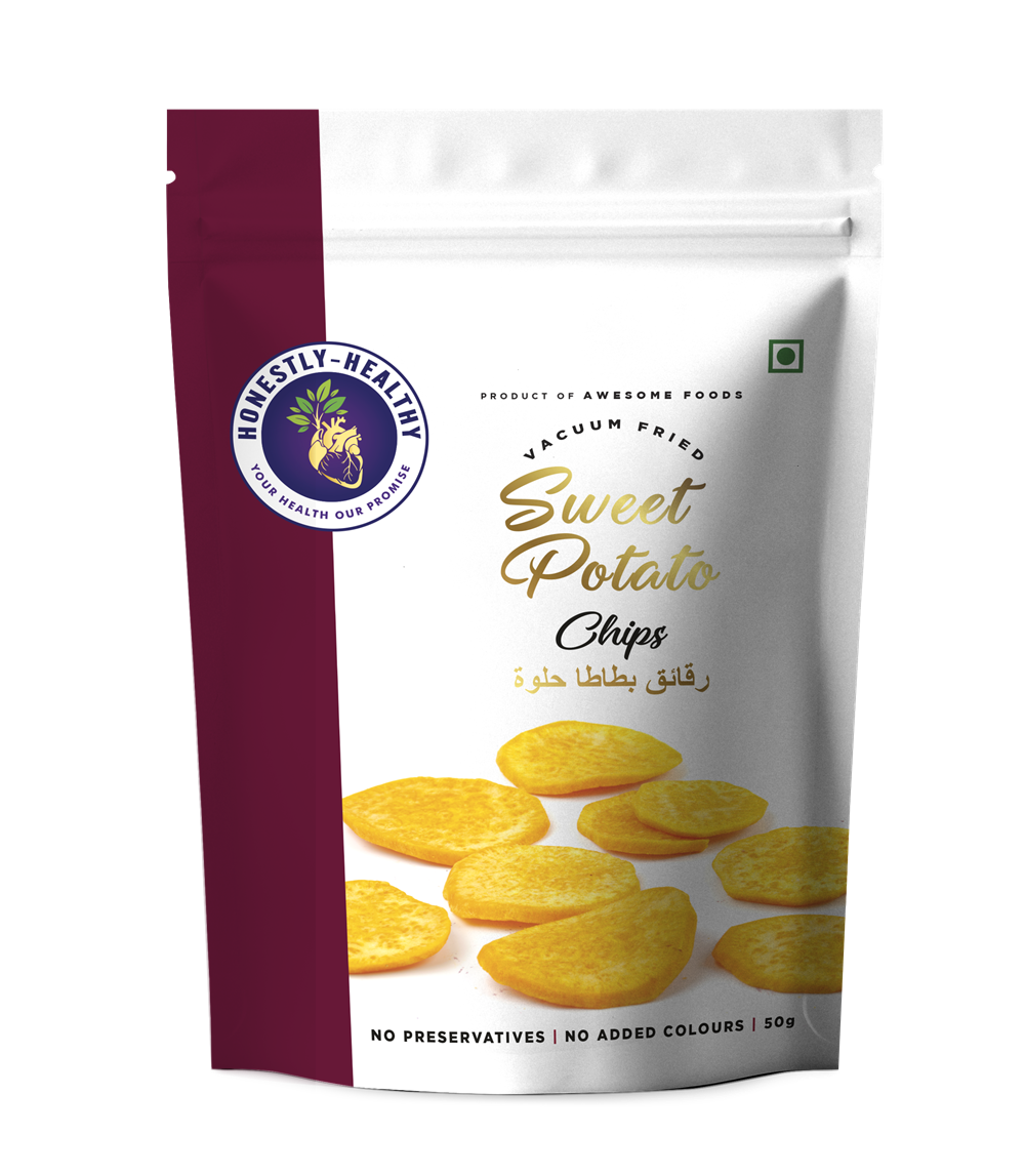 Sweet potato slices vacuum-fried for a tender-crisp bite and natural sweetness. A visually striking, nutrient-forward snack made with a short, transparent ingredient list. Serve with dips or as a colourful platter addition – premium texture, pure ingredients.